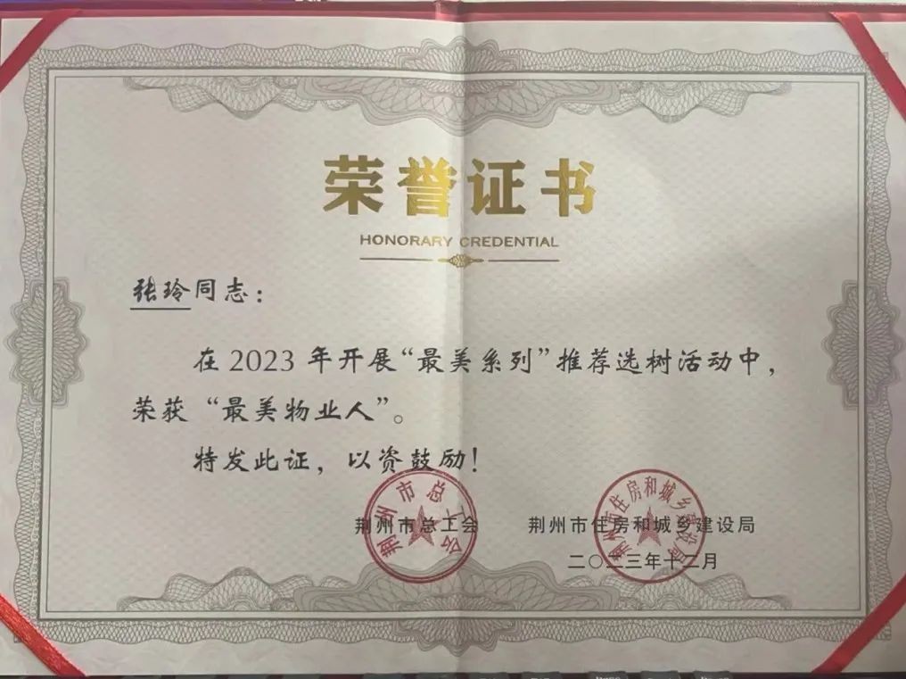 同時(shí),在2023年的“最美系列”推薦選樹(shù)活動(dòng)中,荊州市評(píng)選出了10位物業(yè)人員獲得“最美物業(yè)人”榮譽(yù)稱號(hào)。湖北福晟物業(yè)有限公司高級(jí)主管張玲玲由于在黨建引領(lǐng)的紅色物業(yè)服務(wù)企業(yè)中取得了出色成績(jī),成為監(jiān)利市首位獲得“最美物業(yè)人”個(gè)人榮譽(yù)稱號(hào)的優(yōu)秀人才。