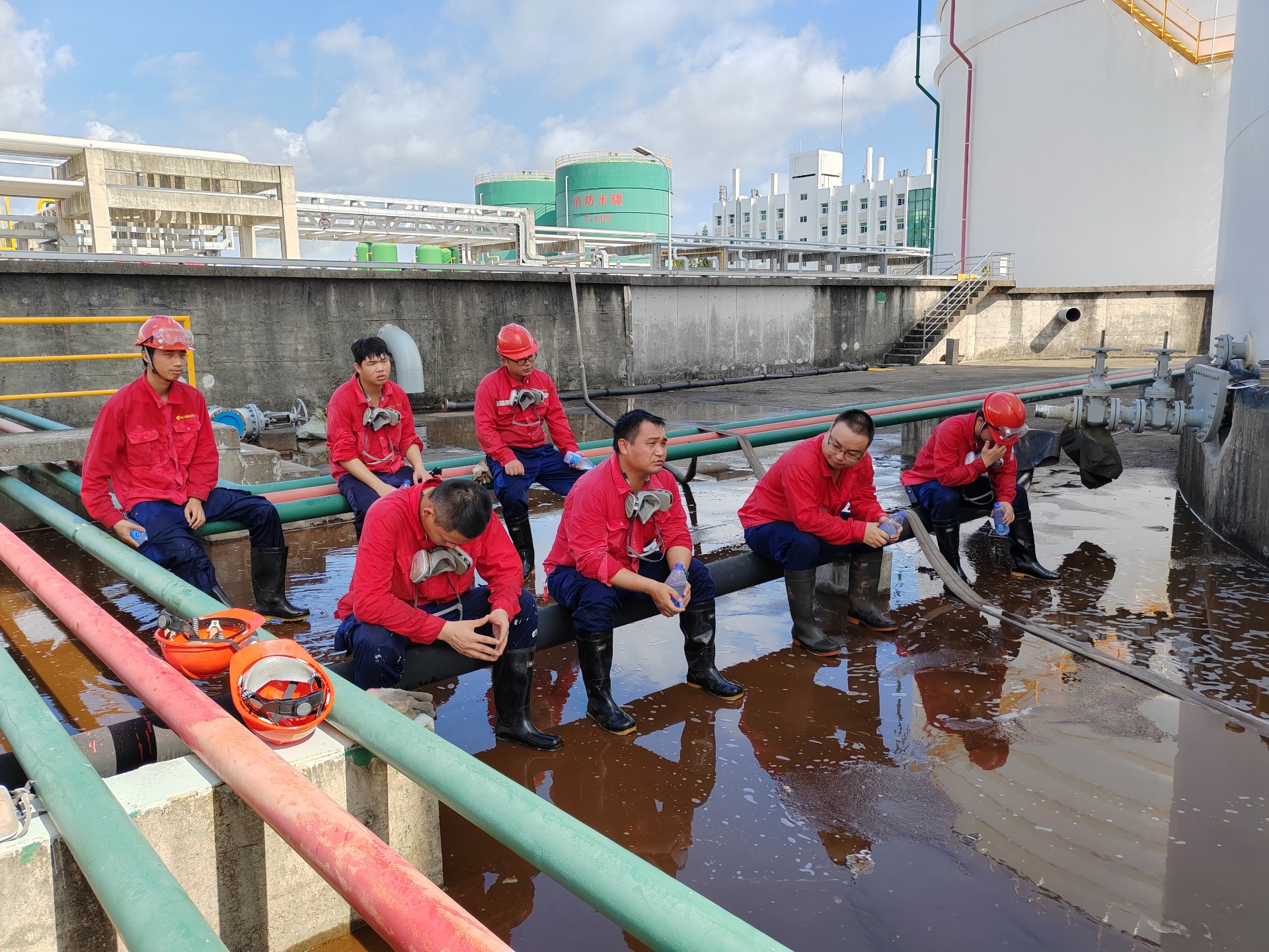 近期,興盛油庫(kù)積極推進(jìn)對(duì)各儲(chǔ)罐頂通氣窗以及新增加油氣回收管支架動(dòng)火改造,為確保儲(chǔ)罐高風(fēng)險(xiǎn)施工動(dòng)火安全萬(wàn)無(wú)一失。8月6日星期天,生產(chǎn)操作部再次組織人員加班加點(diǎn),在悶熱的受限空間儲(chǔ)罐內(nèi)部,對(duì)T1104罐進(jìn)行清罐作業(yè),消除安全隱患;清罐過(guò)程中,每位員工均被汗水濕透了全身,在炎熱的夏季,頭頂高溫酷暑,以實(shí)干的精神,再一次彰顯興盛油庫(kù)團(tuán)隊(duì)是一只特別能吃苦、特別能忍耐、特別能戰(zhàn)斗的鐵軍。