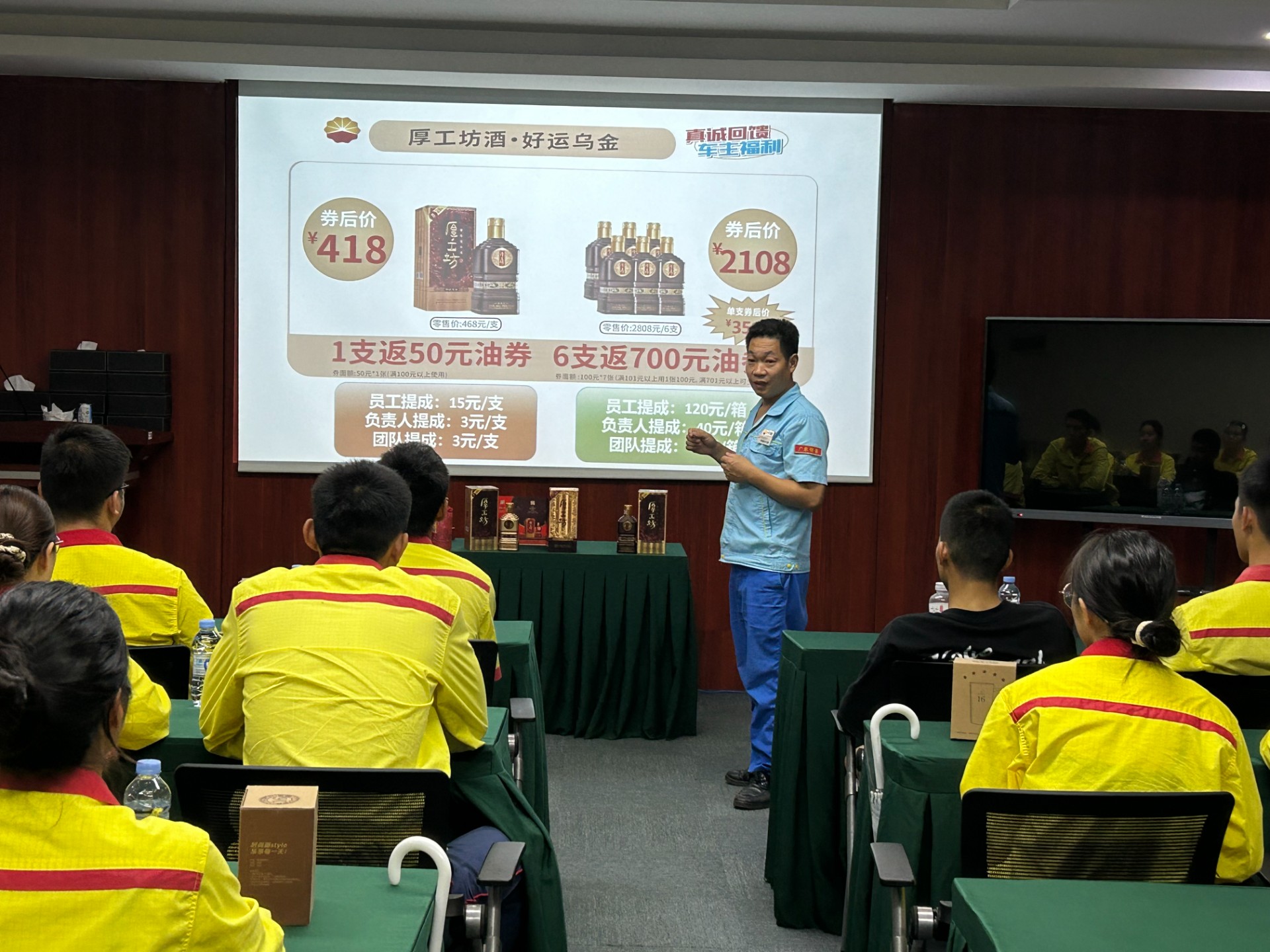 近日,為了調(diào)動(dòng)員工促銷積極性,提升便利店銷量,更好促進(jìn)油非互動(dòng),非油品部新增自營(yíng)酒類禮包銷售。11月2日,非油品部組織友潤(rùn)全體員工到友之源會(huì)議室,開展厚工坊酒類產(chǎn)品銷售培訓(xùn)會(huì)。此次共上新三款酒,非油品部胥輝云經(jīng)理對(duì)每一款酒的特點(diǎn)、賣點(diǎn)以及員工促銷提成方面進(jìn)行了逐一宣講。片區(qū)負(fù)責(zé)人侯永平在會(huì)議中講解開展禮包促銷活動(dòng)的原因和開展禮包促銷的方法,提升員工促銷的主動(dòng)性。