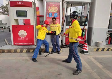 2019年12月13日,為了加強員工安全意識,提高油站防爆反恐應(yīng)急能力,新田加油站組織開展了防爆反恐演練。演練模擬一名手持兇器的嫌疑人突然闖入油站并沖向加油機,拔出加油槍企圖點燃加油槍進(jìn)行縱火;員工見狀立刻關(guān)閉加油槍開關(guān),安撫歹徒情緒與其周旋,其他員工立即拿起油站的防爆工具前去支援;最后員工合力將歹徒制服帶離現(xiàn)場,油站排除隱患后正常營業(yè)。